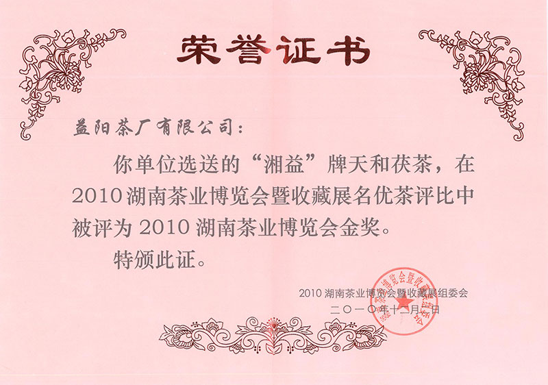 2010年湖南省茶业博览会金奖