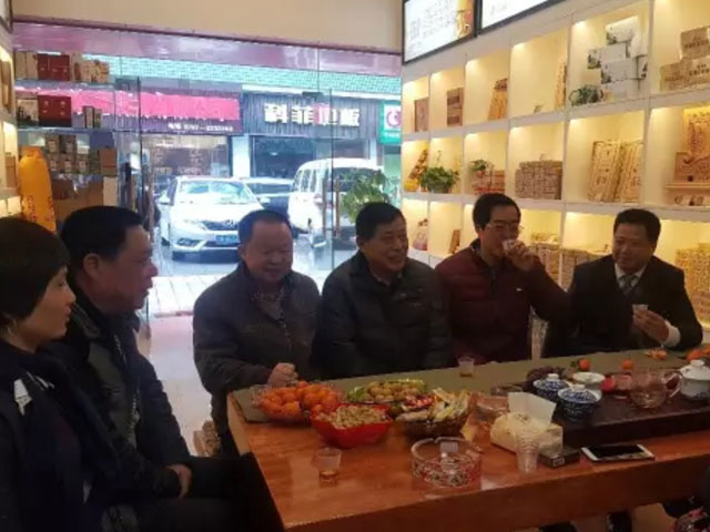 图为政协安化县委员会原主席、安化县茶业协会会长李俊夫(右三)、益阳市茶叶局副局长龚巨成(左二)、安化县茶业协会秘书长曾学军(左三)在公司常务副总经理徐迪军(右二)、国家非遗代表性传承人刘杏益的陪同下(左四)品饮湘益茯茶。