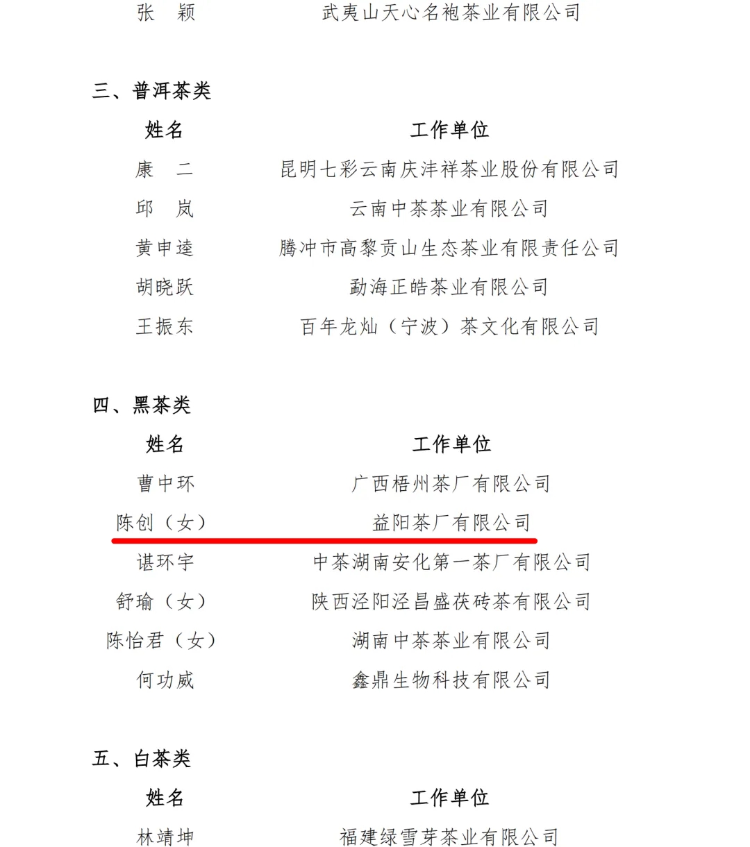 近日中国茶叶流通协会公布了2025“国茶人物·制茶大师”第十批调查结果及2025“国茶人物·制茶能手”第五批调查结果。其中,益阳茶厂有限公司陈创同志获评“国茶人物·制茶能手”(黑茶类)。