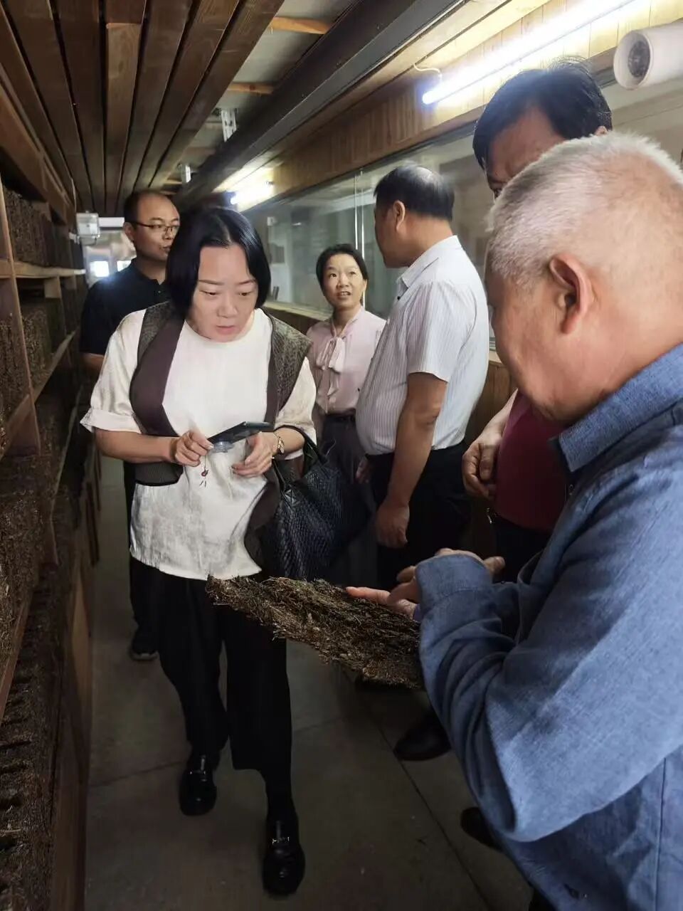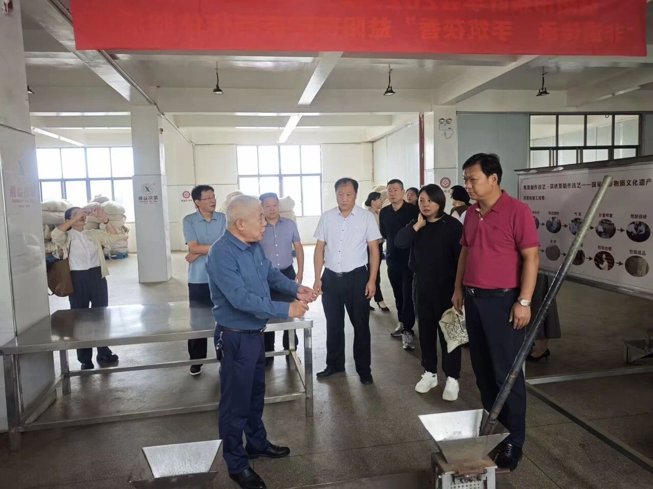 在公司总经理余智勇,党委书记、常务副总经理徐迪军,首席专家、茯砖茶制作技艺国家级非遗传承人刘杏益等的陪同下,调研组实地考察了生产车间、湘益茶博馆。在生产一线,调研组细致察看了茯砖茶的传统制作工艺流程;在茶博馆,深入了解了茯茶深厚的历史底蕴与企业发展历程。