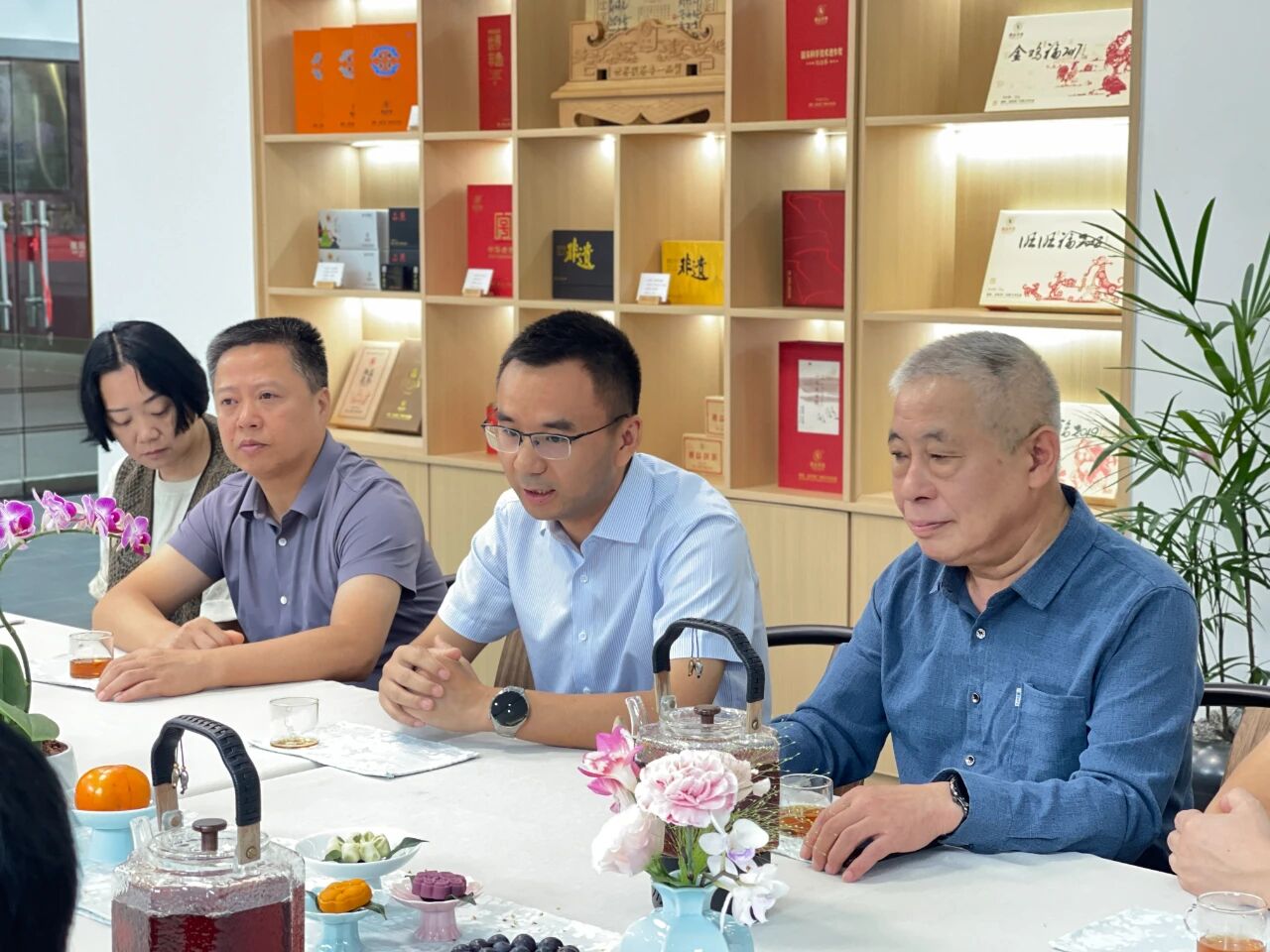 随后,在湘益体验馆举行的品鉴交流中,调研组与公司团队围绕非遗技艺的活态传承与品牌建设等议题进行了深入探讨。陈利文副处长对公司在非遗保护与传承方面取得的成就给予充分肯定,并鼓励企业深化“非遗+产业”融合发展,让茯砖茶这一传统技艺在新时代焕发更加绚丽的光彩。